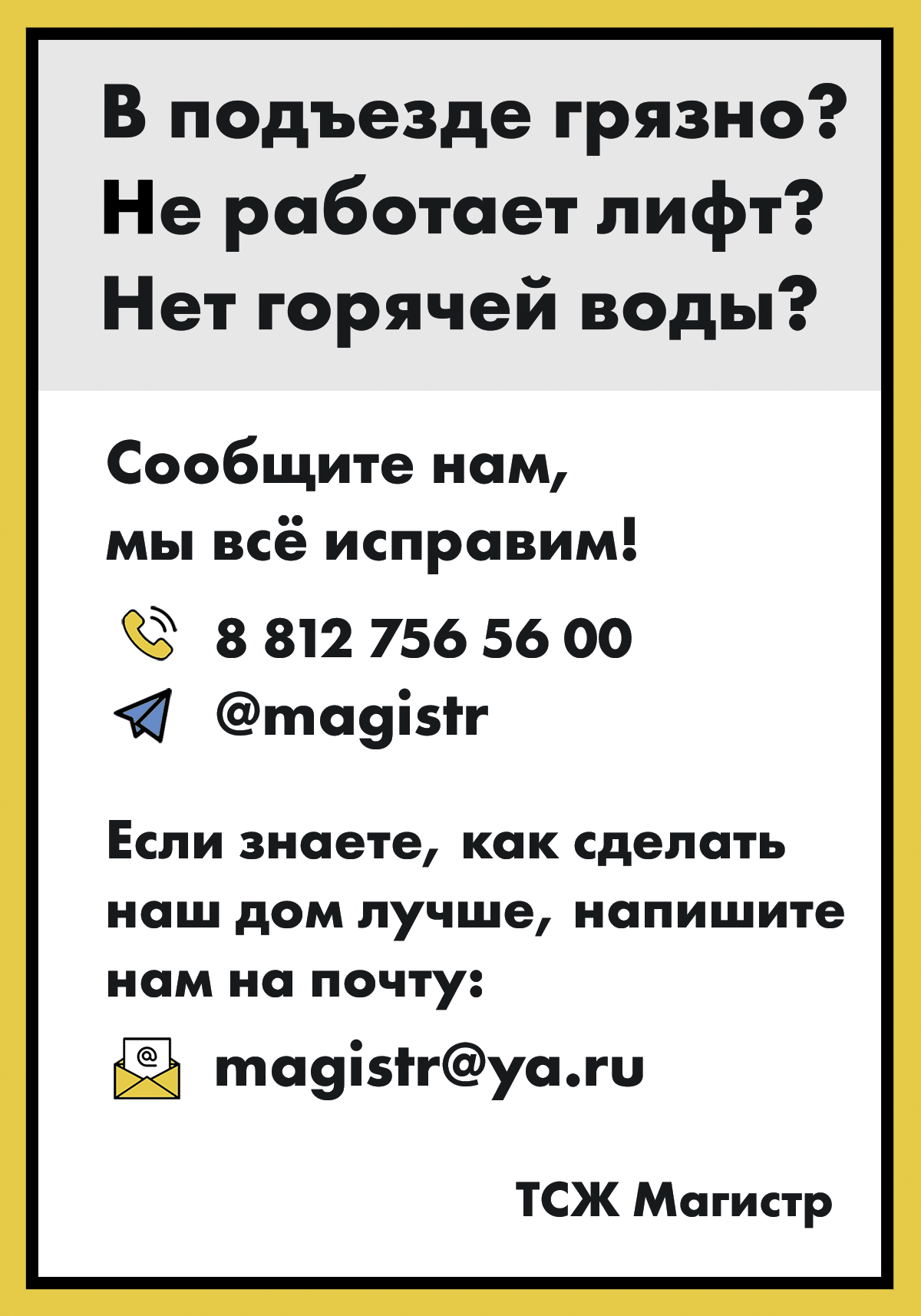 канала информации: телефон, так как он есть у каждого, телеграм — для тех, кому удобнее написать, а для предложений по улучшению дома — электронную почту, так как это несрочно.